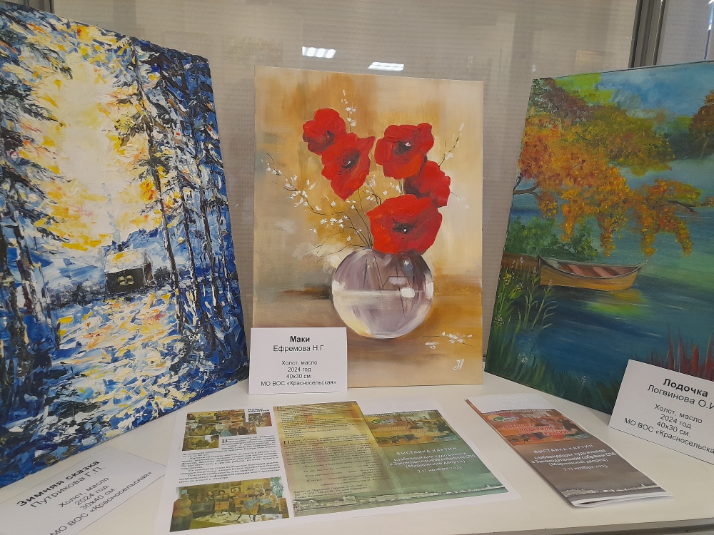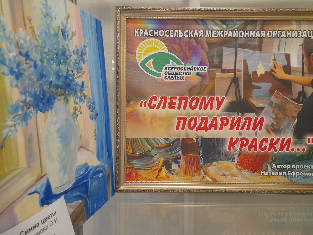 На организованной совместно с библиотекой «Точки зрения» выставке были представлены работы слабовидящих художников Местной организации Всероссийского общества слепых «Красносельская». На базе данной местной организации ВОС, а также в других городах России с 2017 года было создано около 1000 работ.